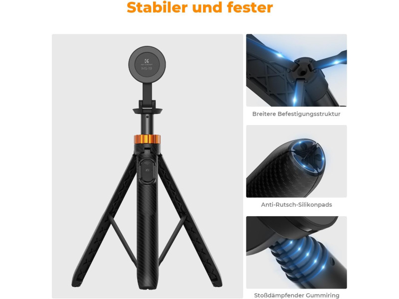 Съёмный пульт дистанционного управления Bluetooth делает процесс фотографирования особенно удобным для селфи и групповых снимков в путешествиях, обеспечивая управление одной кнопкой и до 10 часов непрерывной работы. А нескользящие силиконовые накладки и амортизирующие резиновые кольца на дне штатива увеличивают его устойчивость и прочность, делая MS19 надежным инструментом для любых условий съемки